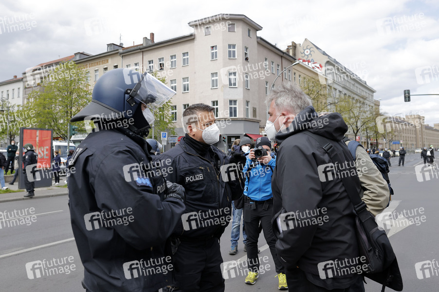 dju-Landesgeschäftsführer Jörg Reichel hat ein Gespräch mit dem Polizeiführer geführt und ihn aufgefordert, mäßigend auf das aggressive Verhalten der Beamten gegen die Presse einzuwirken. Der Polizeiführer bittet um Entschuldigung gegenüber den Journalist*innen. Demonstration in Kreuzberg unter dem Motto 'Generation miteinander - Herzensangelegenheit' aus dem Kreis der Querdenker-Bewegung. Am Rande der Demo kam es zu zahlreichen Gegenprotesten. Berlin, 24.04.2021
