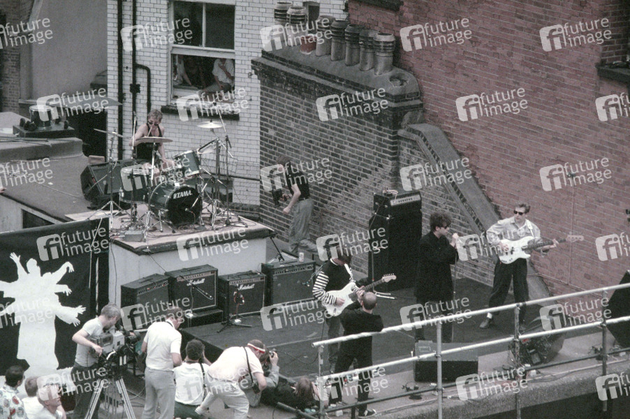 Pete de Freitas, Will Sergeant, Ian McCulloch und Les Pattinson von Echo & the Bunnymen live bei einem Rooftop-Konzert zum 20 jährigen Jubiläum des Beatles-Albums 'Sgt. Pepper’s Lonely Hearts Club Band' auf dem Dach vom HMV Record Store in der Oxford Street. London, 06.07.1987
