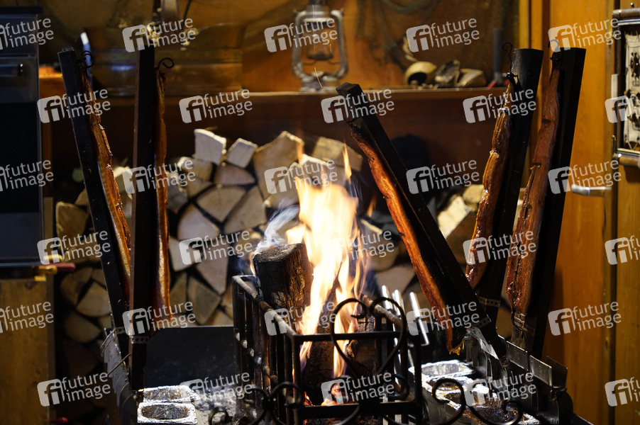 Am offenen Feuer gegrillter Lachs auf dem Weihnachtsmarkt am Roten Rathaus. Berlin, 02.12.2022