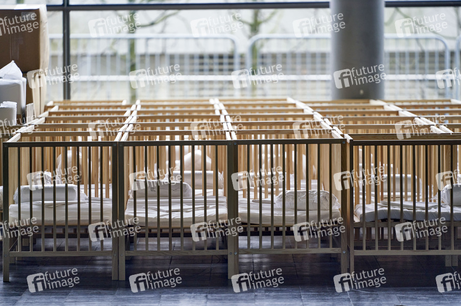 Kinderbetten - Zeltdörfer-Unterkünfte für ukrainische Kriegsflüchtlinge in der Halle 27 auf dem Messegelände, inklusive Wasch- und Duschmöglichkeiten, errichtet von der Feuerwehr Hannover. Die spätere Versorgung erfolgt durch das DRK. Hannover, 06.03.2022