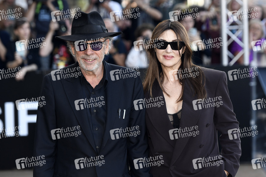 Tim Burton und Monica Bellucci bei der Ankunft am Hotel Maria Cristina auf dem 72. Internationalen Filmfestival San Sebastian / Festival Internacional de Cine de San Sebastián. San Sebastian, 25.09.2024