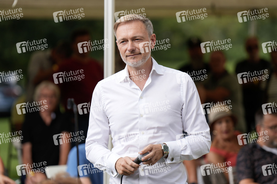 Christian Lindner bei einer Wahlkampfveranstaltung der FDP zur Landtagswahl in Brandenburg im Mahlower Seebad. Blankenfelde-Mahlow, 15.08.2024