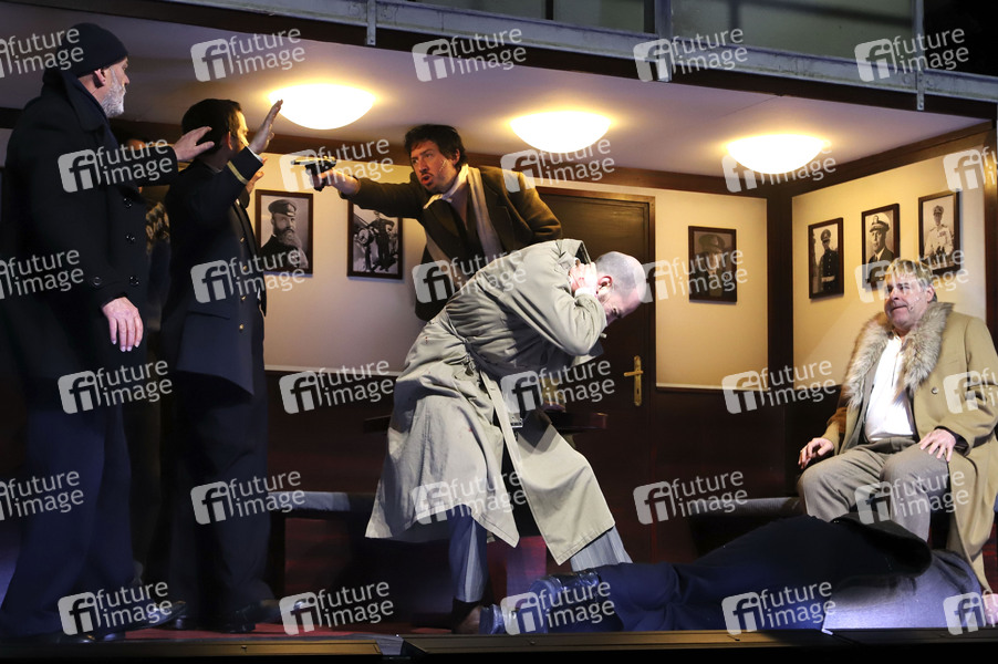 Peter Kaempfe, Jannik Nowak, Nikolai Amadeus Lang, Colin Hausberg, Anton Pleva und Oskar Ketelhut bei der Fotoprobe zum Theaterstück 'Dat Füerschipp' im Ohnsorg Theater. Hamburg, 02.03.2023