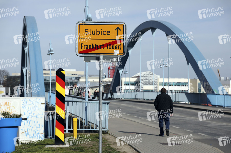 Polizisten und Zollbeamte kontrollieren den Grenzübergang zwischen Frankfurt (Oder) und Slubice. Die Grenzen zwischen Polen und Deutschland sind wegen des Coronavirus geschlossen. Frankfurt (Oder), 16.03.2020