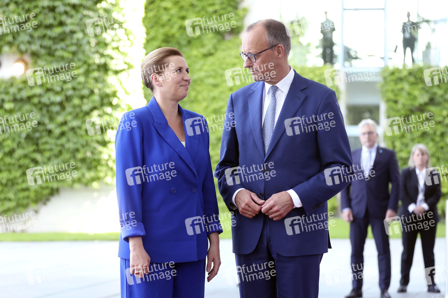 Mette Frederiksen und Friedrich Merz beim Empfang der dänischen Ministerpräsidentin mit militärischen Ehren zu einem gemeinsamen Gespräch mit anschließendem Pressestatement im Bundeskanzleramt. Berlin, 11.06.2025