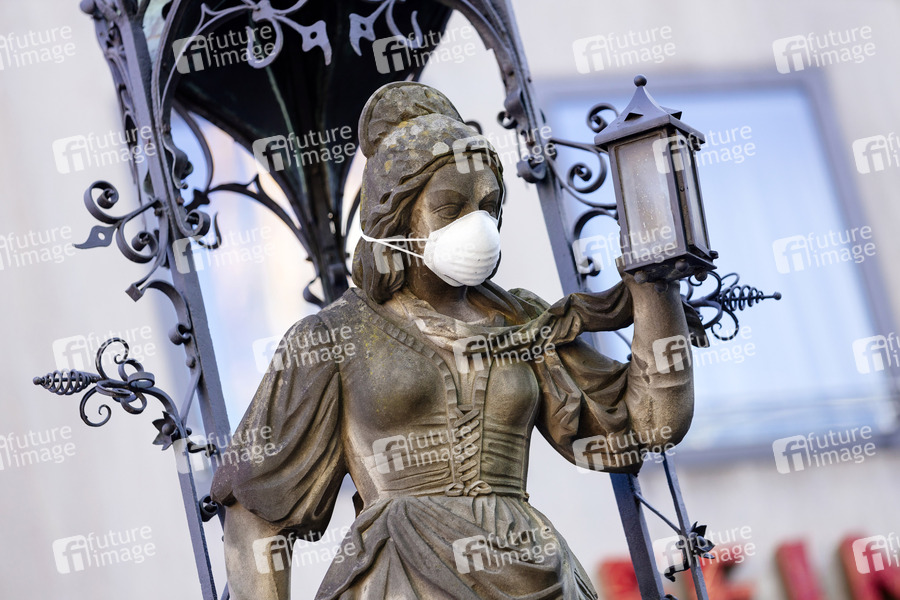 Schneidersfrau auf dem Heinzelmännchenbrunnen mit Atemschutzmaske