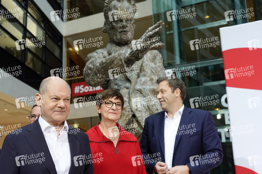 Olaf Scholz, Saskia Esken und Lars Klingbeil bei der Pressekonferenz der SPD nach den Gremiensitzungen zur Beratung aktueller Themen und der Nominierung des SPD-Kanzlerkandidaten für die Bundestagswahl im Atrium vom Willy-Brandt-Haus. Berlin, 25.11.2024