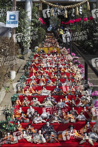Etwa 1000 traditionelle Hina-Puppen auf den 77 Stufen des Zama-Schreins. Das Hina Matsuri, das Puppen- oder Mädchenfest, findet in Japan jedes Jahr am 3. März statt. Hierbei handelt es sich um ein japanisches Familienfest, anlässlich dessen für Glück und Gesundheit junger Mädchen gebetet wird. Zama, 01.03.2022