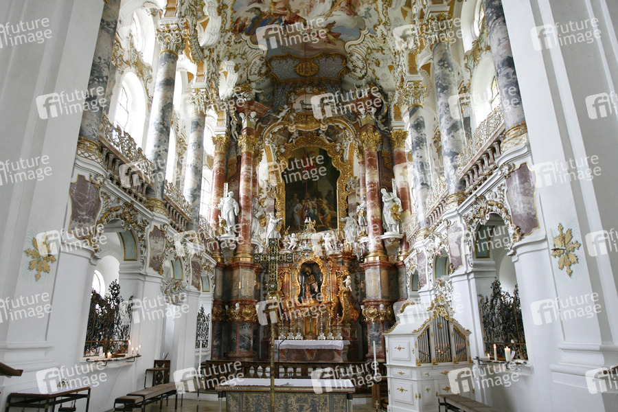 Kirche, erbaut 1745–1754 von den Brüdern Johann Baptist und Dominikus Zimmermann, dem Gegeißelten Heiland geweiht, Rokoko, 1983 zum Weltkulturerbe erklärt, Altar