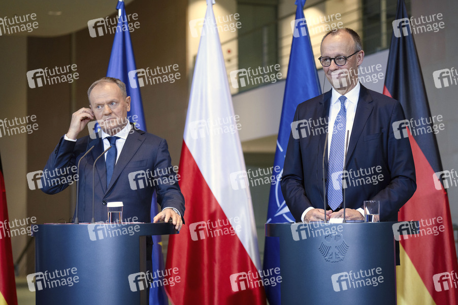 Donald Tusk und Friedrich Merz beim Pressestatement zu den 17. Deutsch-Polnischen Regierungskonsultationen im Bundeskanzleramt. Berlin, 01.12.2025