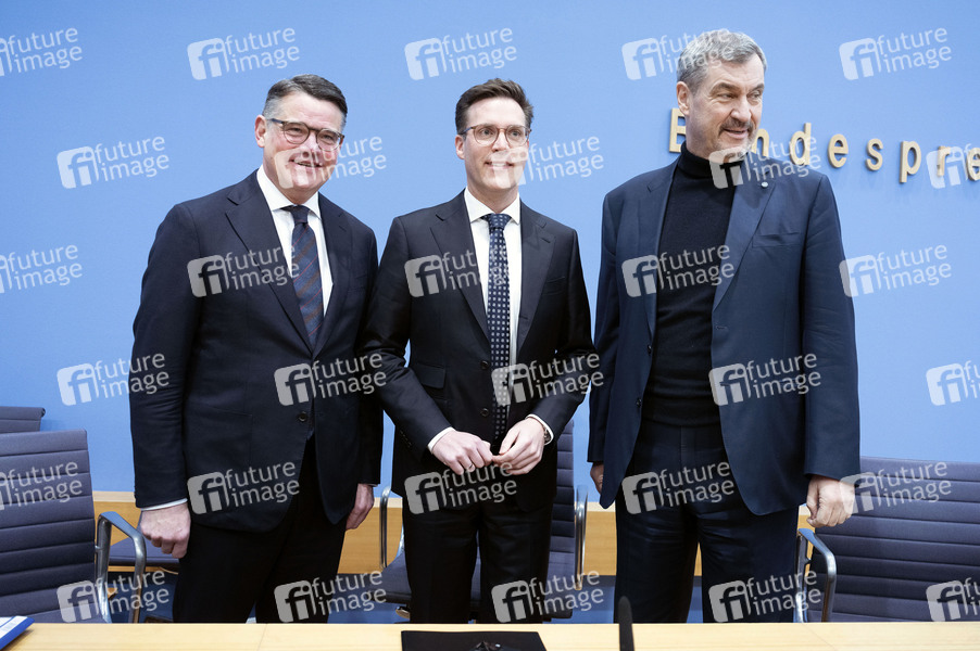 Boris Rhein, Manuel Hagel und Markus Söder bei der Bundespressekonferenz '3 Löwen Allianz' im Haus der Bundespressekonferenz. Berlin, 30.01.2026