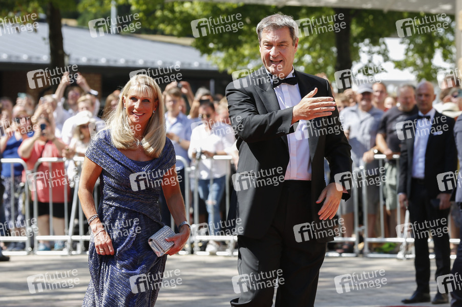 Markus Söder mit Ehefrau Karin Baumüller-Söder bei der Eröffnung der Richard-Wagner-Festspiele 2022 mit der Neuinszenierung von Richard Wagners 'Tristan und Isolde' im Bayreuther Festspielhaus. Bayreuth, 25.07.2022