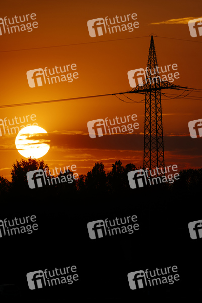 Abendsonne hinter Stromleitung bei Meschenich. Köln, 27.04.2020