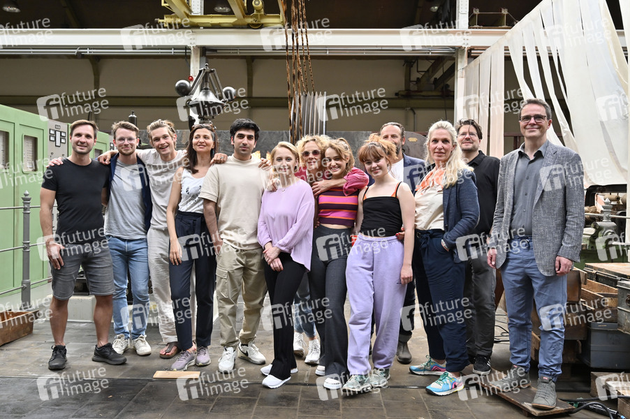 Thomas Schiller, Eike Adler, Damian Hardung, Mira Thiel, Omid Memar, Anna Maria Mühe, Katja Riemann, Rocio Luz, Ella Lee, Marcus Welke, Caren Toennissen, Benjamin Benedict und Alexander Bickel beim Fototermin am Set der 2. Staffel der ARD TV-Serie 'Unsere wunderbaren Jahre' im Monforts Quartier. Mönchengladbach, 14.06.2022
