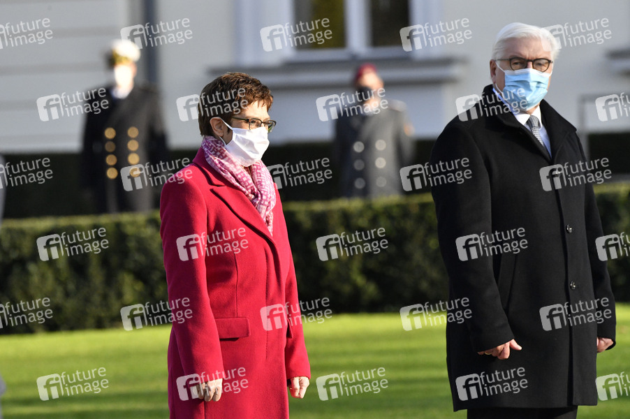 Annegret Kramp-Karrenbauer und Frank-Walter Steinmeier bei der Ansprache des Bundespräsidenten beim Feierlichen Gelöbnis zum 65. Gründungstag der Bundeswehr vor dem Schloss Bellevue. Berlin, 12.11.2020