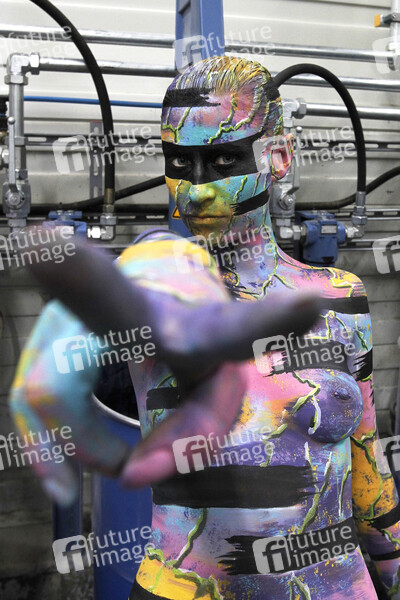 Jörg Düsterwald, einer der bekanntesten Bodypainting- und Bodyartkünstler Deutschlands macht auf seine ganz eigene Art auf die prekäre Situation freischaffender Künstler während der Corona-Pandemie aufmerksam: Unter dem Hashtag #WirzeigenFarbe hat der Hamelner Künstler in der Produktionshalle der Druckerei QUBUS media mit seinem Model Lisa ein ausdruckstarkes Live-Bodypainting inszeniert - denn Künstlerinnen und Künstler wie er sehen und fühlen sich derzeit wortwörtlich 'ausgezogen bis aufs letzte Hemd'. Und nichts symbolisiert diesen bekannten Spruch besser als ein Bodypainting auf nackter Haut in einer Umgebung, in der es jeden Tag um Farbe geht. Die Live-Performance fand mit dem zeitgleichen Druckstart von Jörg Düsterwald's neuem Premiumkalender 'Bodypainting in Nature 2021' statt. Hannover, 14.07.2020