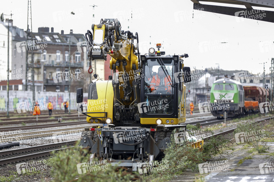 Zweiwegebagger beim Fototermin 'Endspurt für das Elektronische Stellwerk (ESTW) Linker Rhein' am Bahnhof Köln-West. Köln, 13.03.2024