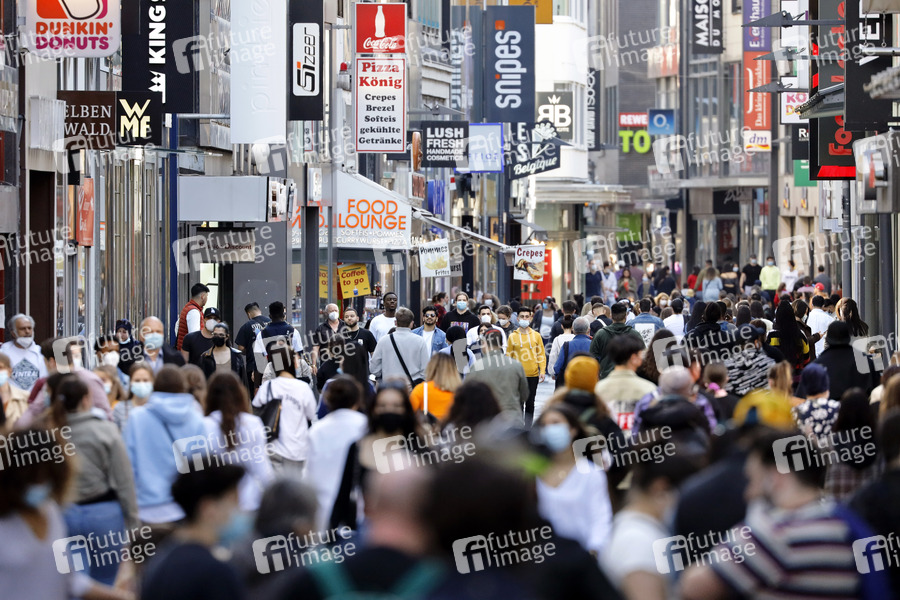 Bei sonnigem Wetter und frühlingshaften Temperaturen tummelten sich viele Passanten in der Kölner City. In Köln gelten in der Innenstadt strenge Corona-Maßnahmen wie Maskenpflicht und Mindestabstand. Seit Montag gilt die Corona-Notbremse in Kreisen und kreisfreien Städten in NRW, Sieben-Tage-Inzidenz über 100 liegen. Die Notbremse ist in der Corona-Schutzverordnung verankert. (Themenbild, Symbolbild) Köln, 29.03.2021