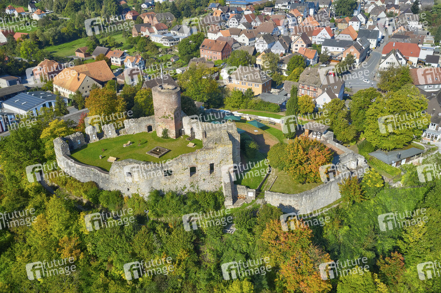 Luftbild der Eversteiner Burgruine Polle. Polle, 09.10.2021