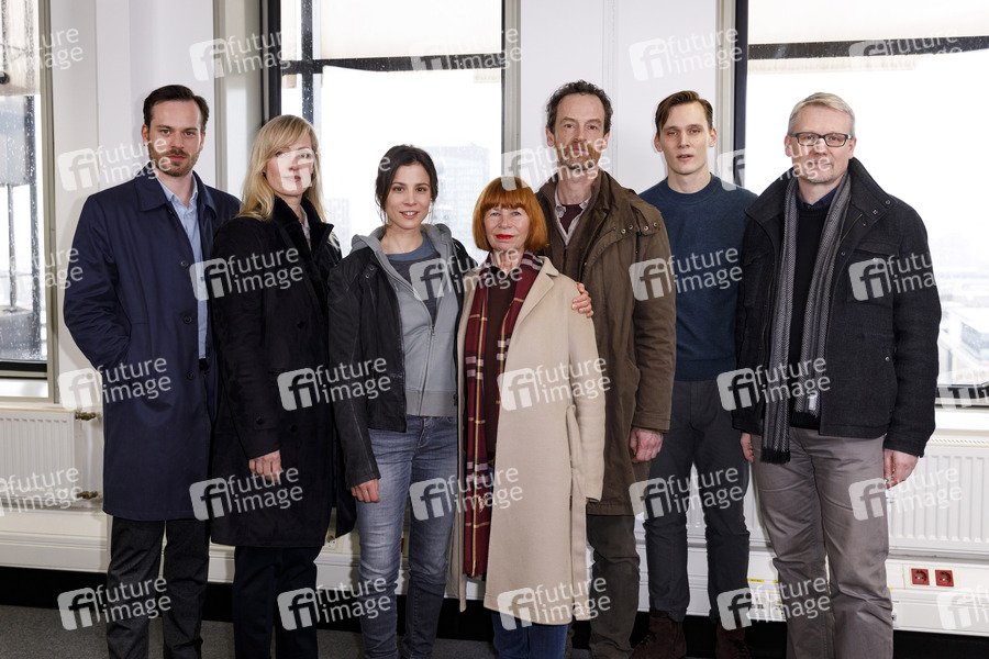 Florian Bartholomäi, Anna Schudt, Aylin Tezel, Sonja Goslicki, Jörg Hartmann, Rick Okon und Frank Tönsmann beim Fototermin am Set des ARD-Krimis 'Tatort - Monster' im RAG-Hochhaus. Dortmund, 14.03.2019