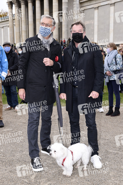 Patrick Lindner mit Ehemann Peter Schäfer und Hund Obelix bei der Kundgebung 'Aufstehen für Kultur' auf dem Königsplatz. München, 24.10.2020