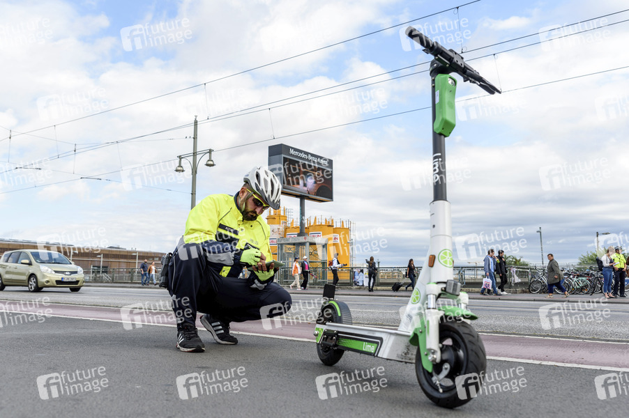Polizisten der Fahrradstaffel kontrollieren FahrerInnen von E-Scootern auf dem Warschauer Brücke in Berlin-Friedrichshain: Polizist stellt einen Strafzettel aus, weil der E-Scooter auf dem Gehweg abgestellt wurde. Berlin, 13.09.2019