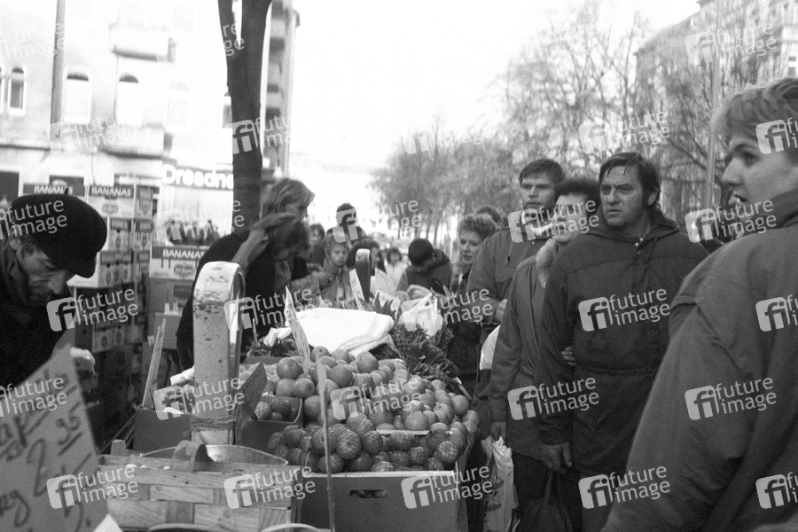 Mauerfall - Besucher aus Ostberlin bestaunen die Waren eines Gemüsehändlers am Schlesischen Tor in Berlin-Kreuzberg. Berlin, 10.11.1989