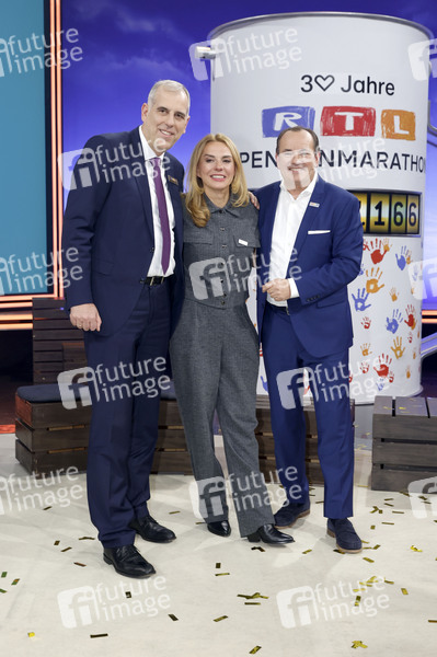 Stephan Schmitter, Inga Leschek und Wolfram Kons beim 30. RTL-Spendenmarathon 2025 im Studio 8 der EMG Studios. Hürth, 21.11.2025