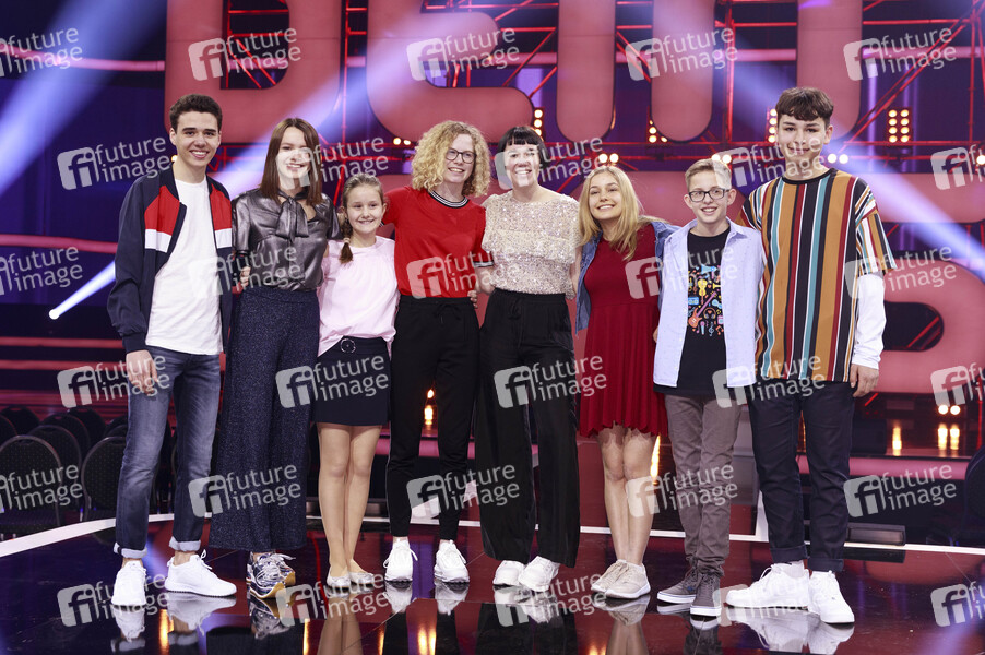 Die Finalisten: Levent (15) aus Stockdorf, Eliana (16) aus Remchingen, Raphaela (12) aus Aalen, Hannah (17) aus Minden, Merle (17) aus Steinfurt, Lily (15) aus Bad Hofgastein , Guilo (12) aus Freiburg und Peer (14) aus München beim Photocall zum Finale der 11. Staffel der KiKA Casting-Show 'Dein Song' in den MMC-Studios. Köln, 20.03.2019