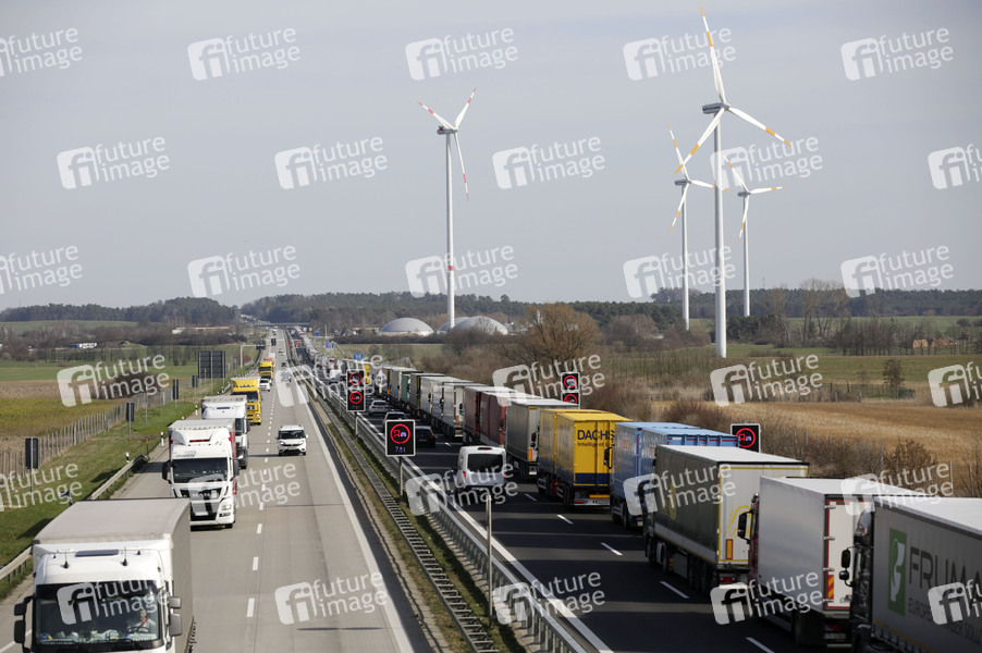 LKWs stehen auf der A12 in Fahrtrichtung Polen im Stau. Die Grenzen zwischen Polen und Deutschland sind wegen des Coronavirus geschlossen. Frankfurt (Oder), 16.03.2020