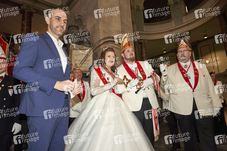 Belit Onay, Ihre Lieblichkeit Prinzessin Cara I., Seine Tollität Prinz Lukas I. und Ronny Jackson bei der Stürmung des Neuen Rathauses durch die Hannoveraner Karnevalsvereine und der Proklamation der Prinzenpaare 2021 mit Übergabe des Stadtschlüssels. Hannover, 13.11.2021