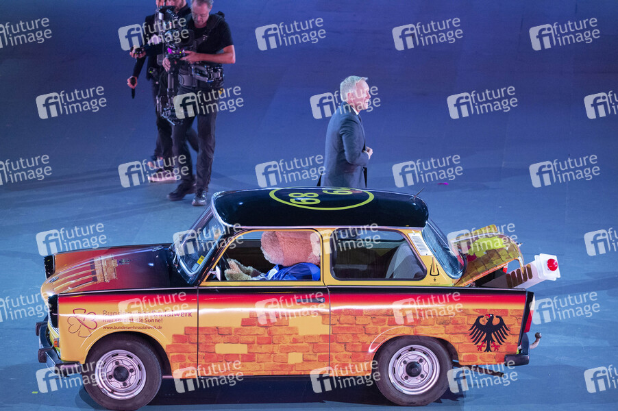 Trabbi 'Willi' und Musikfestmaskottchen Paul beim Musikfest der Bundeswehr, Internationales Militär Tattoo im ISS Dome. Düsseldorf, 21.09.2019