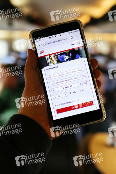 Reiseauskunft der Deutschen Bahn unter bahn.de aufgenommen in einem ICE. Köln, 13.03.2019