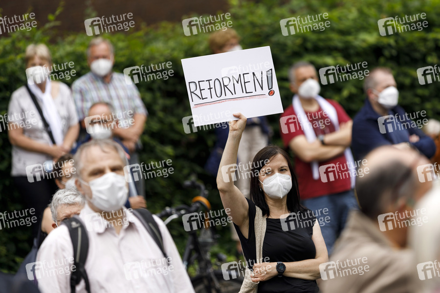 Bei einer Kundgebung auf dem Börsenplatz kritisieren Gläubige aus dem Erzbistum Köln und Aktivisten der Bewegung Maria 2.0 das Verhalten der Kirche und Erzbischof Rainer Maria Kardinal Woelki bei der Aufarbeitung des Missbrauchskandal. Am Nachmittag trifft auch eine Pilgergruppe von Pfarrer Klaus Koltermann aus Dormagen Nievenheim mit 60 Christen nach 40 Km Fußmarsch unter dme Motto 'Aufbruch nach Köln' auf dem Börsenplatz ein. Koltermann hat sich als einziger Pfarrer in Deutschland für den Rücktritt von Kardinal Woelki ausgesprochen. Köln, 12.06.2021