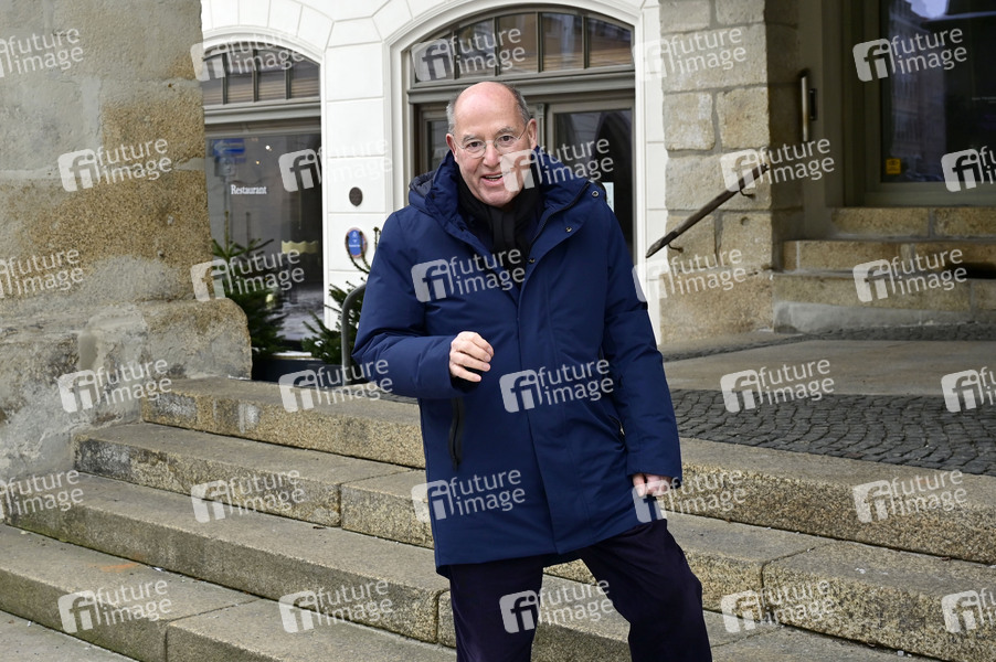 Gregor Gysi bei einer exklusiven Sightseeing Tour durch die Görlitzer Altstadt am Geburtshaus seines Urururgroßvaters, dem Begründer der deutschen Rassegeflügelzucht Robert Oettel am Untermarkt. Görlitz, 02.02.2026