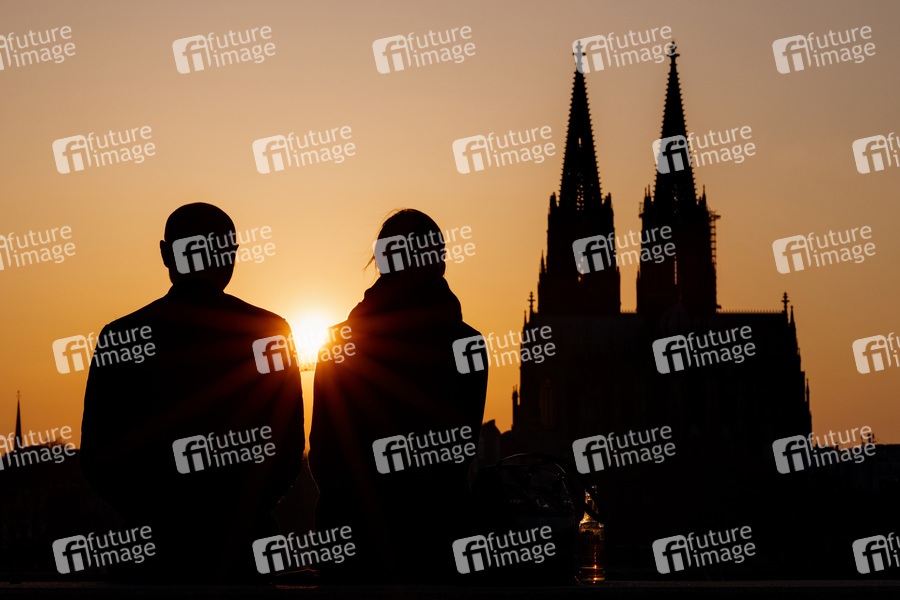 Liebe, Partnerschaft, Paar, Pärchen, Romantik, Frühling, Frühlingsgefühle, Single, Paare, Love, Romance, Partnersuche, Verliebtsein, Dating, Date, Beziehung, verlieben, verliebt, Date, Dating, Nähe, Kölner Dom, Kirche, Kölner Skyline, Rheinpanorama, Kölnpanorama, Tourismus, Abendlicht, Sonnenuntergang, Rheintreppe, Rheinboulevard, Abendstimmung, Symbolfoto, Symbolbild