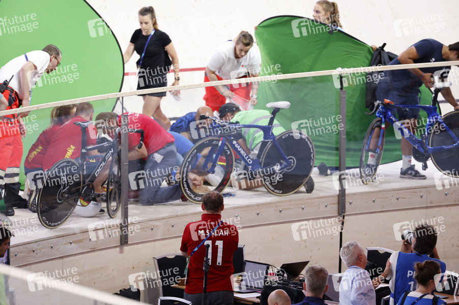 Massensturz beim Finale Ausscheidungsfahren Frauen bei den European Championships 2022 im Bahnradsport in der Messe München. München, 13.08.2022
