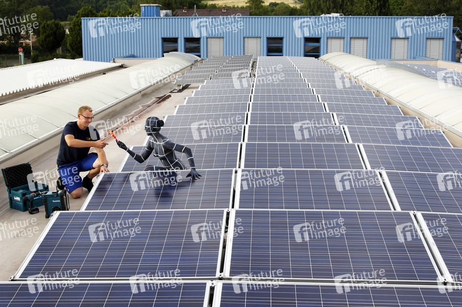 Solardach-Pflicht, Solarpflicht, Klimaschutz-Sofortprogramm 2022, Energie-Standard EH-55, Energie, Solarstrom, Solarzelle, Photovoltaik, Solarpanele, Solarenergie, Sonnenenergie, Solaranlage, Dach, Solarmodule, Nachhaltigkeit, Erneuerbare Energien, Energiewende, Solarzellen, Klima, Umwelt, Ökostrom, Umweltschutz, Body-Painting, Akt, Körperkunst, Körperfarben, Farbe, Bemalung, Kunst, Malerei, Beruf, Solarteur, Strom, Symbolfoto, Symolbild, Model Release