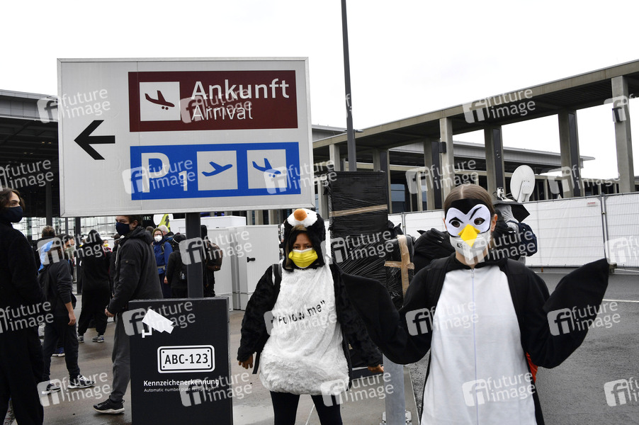 Protestaktionen des Bündnisses 'Am Boden bleiben' bei der Eröffnung des Flughafens Berlin-Brandenburg (BER). Schönefeld, 31.10.2020