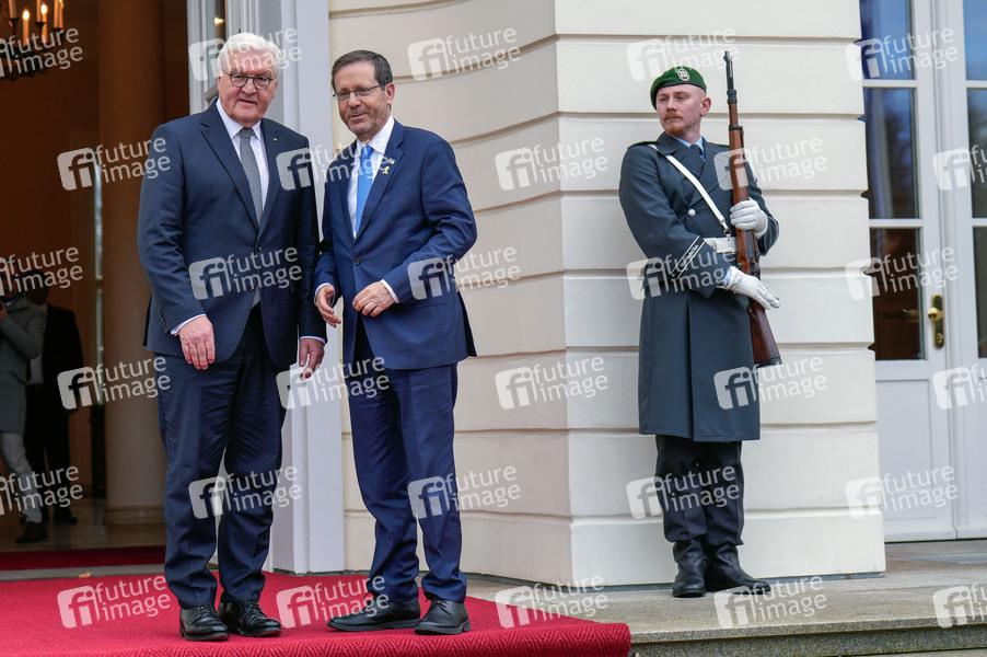 Isaac Herzog und Frank-Walter Steinmeier beim Empfang des Präsidenten des Staates Israel zu einem gemeinsamen Gespräch mit dem Bundespräsidenten und zum Eintrag ins Gästebuch im Schloss Bellevue. Berlin, 16.02.2024