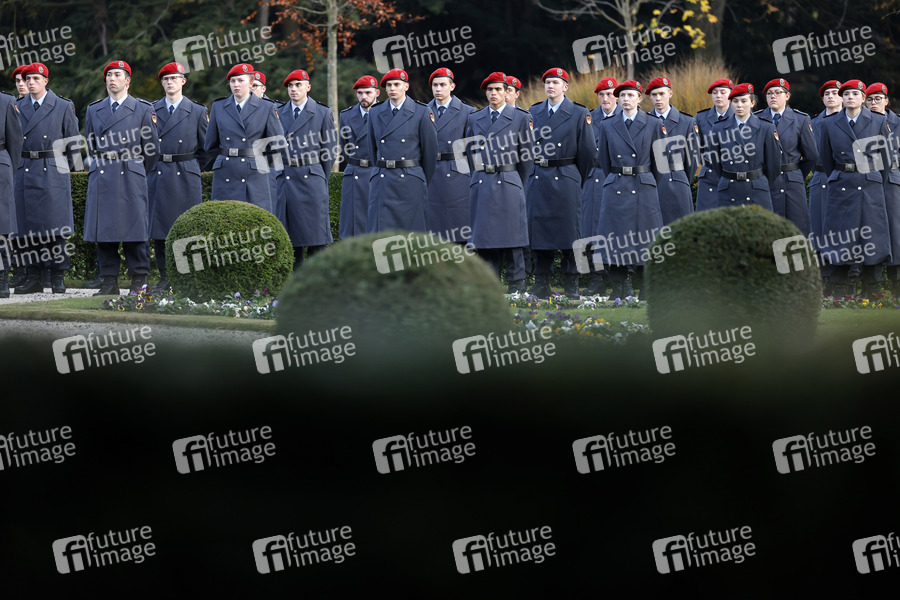 Rekruten und Rekrutinnen nehmen anlässlich des 66. Gründungs-jahres der Bundeswehr am feierlichen Gelöbnis vor der Villa Hammerschmidt in Bonn teil. 50 Soldatinnen und Soldaten des ABC-Abwehrbataillons 7 aus Höxter und des ABC-Abwehrbataillons 750 aus Bruchsal legen hier ihr Gelöbnis ab. Bonn, 12.11.2021