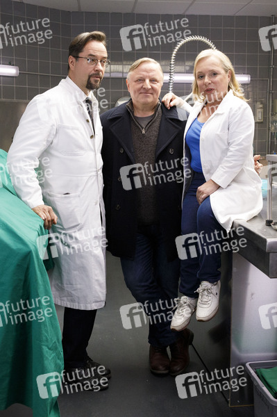 Schauspieler, Schauspielerin, Prof. Karl-Friedrich Boerne und Kriminalhauptkommissar Frank Thiel und Silke 'Alberich' Haller in 'Tatort', Prominenz, TV, Fernsehen, Krimi, Filmset, Fotocall, Photocall, Settermin, Dreharbeiten, TV-Film, Krimireihe, Serie, ARD, Das Erste, WDR, Tatort Münster, Rechtsmedizin