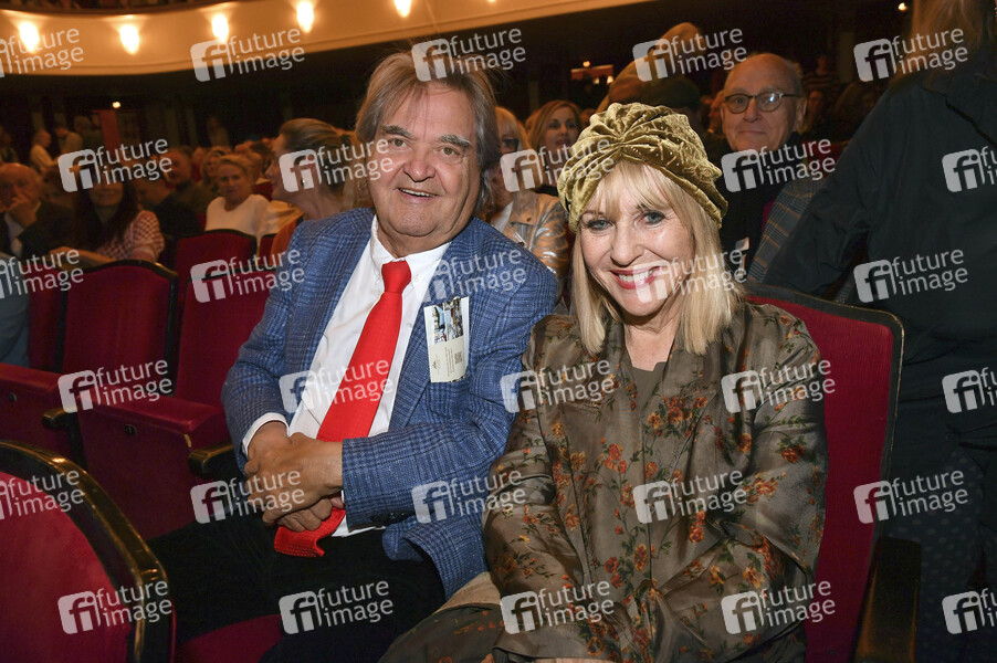 Helmut Markwort mit Partnerin Patricia Riekel bei der Premiere des Theaterstücks 'Nein zum Geld' in der Komödie im Bayerischen Hof. München, 15.05.2025