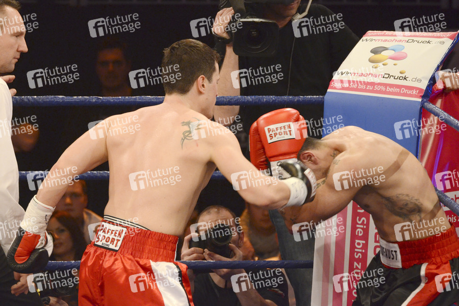 Rocco Stark vs. B-Tight Davis bei der Fernsehshow 'Das große Sat.1 Promiboxen 2013' im Castello. Düsseldorf, 08.03.2013