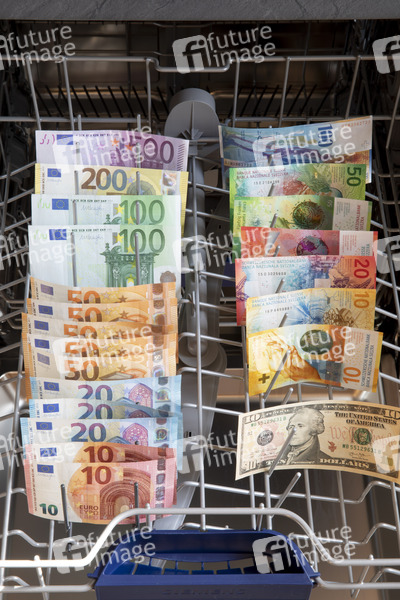 EURO, Schweizer Franken und Dollar Banknoten in einer Geschirrspülmaschine