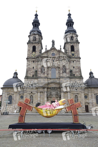 Der Hängemattenbischof bei einer Protestaktion der Giordano-Bruno-Stiftung und der Betroffeneninitiative-Hildesheim bei der Herbst-Vollversammlung der Deutschen Bischofskonferenz auf dem Vorplatz des Doms zu Fulda. Fulda 20.09.2021