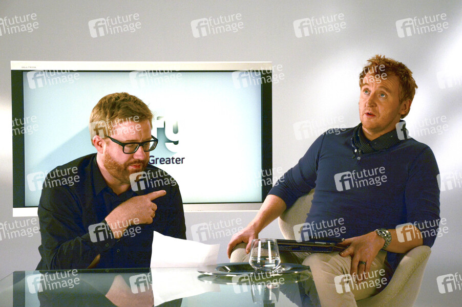 Elmar Krick und Tony Curran beim Dreh für einen Promotion-Spot für die TV-Serie 'Defiance' in den Voss TV Studios. Düsseldorf, 30.05.2014