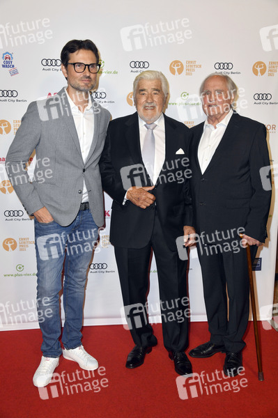 Simon Verhoeven, Mario Adorf und Michael Verhoeven bei der 63. Verleihung vom Ernst-Lubitsch-Preis 2021 in der Astor Film Lounge. Berlin, 28.09.2021