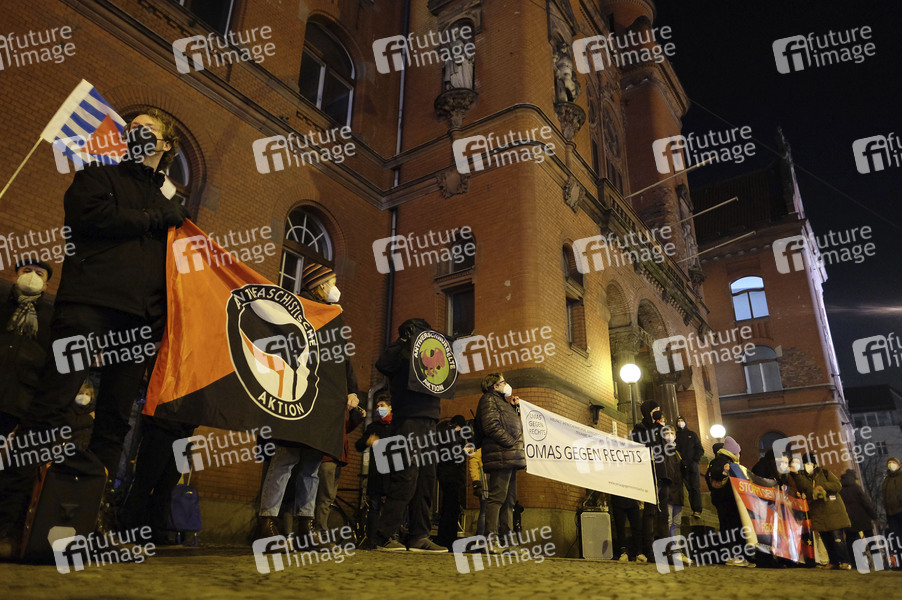 Linke Gruppen protestieren am Rathaus im Berliner Stadtbezirk Pankow gegen eine zeitgleich stattfindende Demonstration von Corona-Skeptikern, Impfgegnern, Verschwörungstheoretikern und Querdenkern. Berlin, 10.01.2022