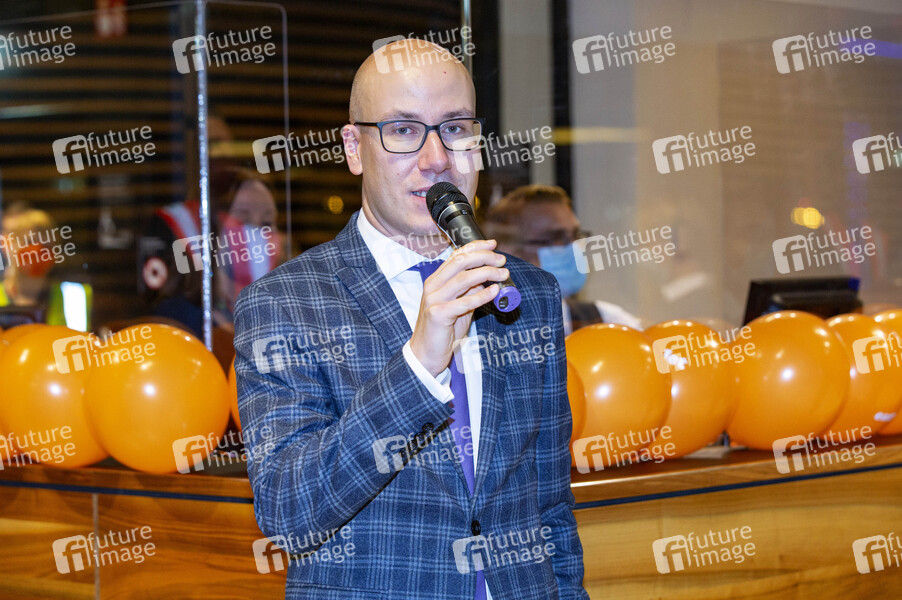 Stephan Erler beim allerersten kommerziellen Abflug vom BER mit easyJet nach London Gatwick am Gate im Non-Schengen-Bereich des Terminal 1 im Flughafen Berlin Brandenburg. Schönefeld, 01.11.2020